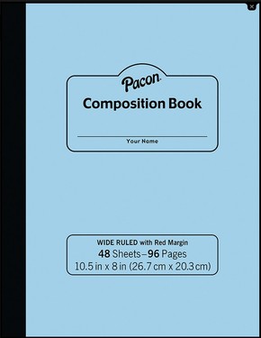 Blue tag composition book with a durable soft cover and 48 sheets to meet your needs. Sheets are wide ruled (3/8in and contain a red margin to help keep your notes neat. Great for note taking and journaling. Recyclable.