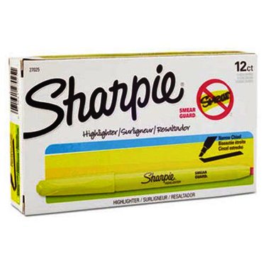 Sharpie Accent Yellow Highlighter Features SMEAR GUARD ink specially formulated to not smear when highlighting over many pen and marker inks including inkjet printouts, written notes, newspapers and more. Versatile chisel tip is great for highlighting or underlining. Quick drying, odorless ink won't fade type or bleed through most paper. Color(s): Fluorescent Yellow; Tip Type: Chisel.Newell Sharpie Accent Pocket Style Highlighter, Chisel Tip, Fluorescent Yellow, Sold by the Dozen.