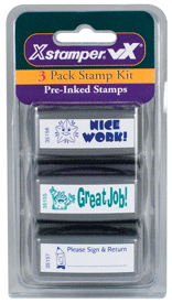 Great for teachers who don't want to go through the trouble of inking with a stamp pad. They are pre-inked and ready to stamp. Each set comes with three different pre-inked stamps.