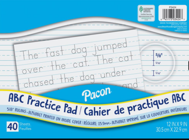 40 sheet, tape-bound booklet of 9" x 12" white bond paper with a stiff cardboard back. Ruled 5/8" long way on both sides with a broken mid-line and space for descenders.