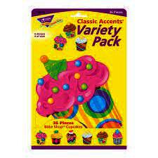 Vibrant designs energize spaces and delight and engage viewers. Label containers, lockers and centers, accent displays, decorate walls and posters, showcase student work, inspire creative writing, and reward accomplishments. Endless possibilities. Precut and ready to use. Durable and reusable. 6 designs, 6 of each. 36 pieces, 5.5" - 6" tall. Coordinates with The Bake Shop Collection.