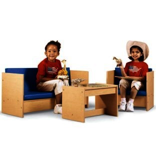 Set will provide children seating in waiting room areas, classrooms, libraries and other places children gather. Well suited in dramatic play and literacy settings, small kids will love to sit and chat or read on their own. Includes 1.5" blue cushions for comfort. Set includes one table, one sofa and one chair. Weight: 79 lbs.. Fully assembled. Dimensions: Sofa: 42"W X 18.5"H X 15.5"D. Chair: 19.5"W X 18.5"H X 15.5"D. Table: 20"W X 10"H X 12.5"D.