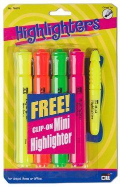 Highlighters come in bright, see-through colors for easy readability. Chisel tipped for fine, medium or broad lines. Comes with 4 assorted colors plus 1 FREE highlighter. Quick drying, Non-toxic and conforms to ASTM D4236.