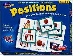 Players gain an understanding of 16 position concepts by matching words with easy-to-identify positions. Boards feature photographs and words on front; photographs on front. Ages 3+. Standard Focus: spatial awareness, vocabulary.