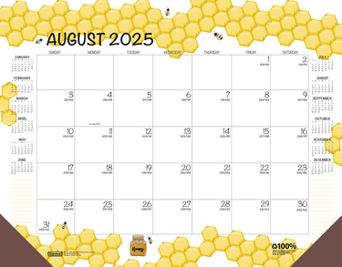 HOD1565 August through July, Honeycomb Desk Pad Calendar, 22 x 17". Show your support for pollinator conservation with this desk pad featuring 6 different rotating honeycomb and bee designs on each month. Full monthly view on each page featuring 2-1/2" x 2-3/8" blocks allocated for each day. Calendar pages are gummed at the top with two brown reinforced corners at the bottom. Full 12-month calendar on each page for longer term planning. Julian dates and days remaining for quick reference. Ample note space is provided on each page for long term planning. Printed on 100% post-consumer recycled FSC certified paper with soy inks.