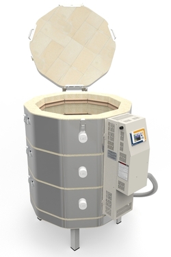 The medium-sized SM23T-3-A School Kiln, boasting a capacity of 6.7 cubic feet, is designed with the innovative Genesis Mini Touchscreen Control for precise temperature management, reaching up to Cone 1 (2080°F, 1140°C), making it an excellent tool for K-12 schools. This kiln is built with an easy-open control panel for hassle-free use, hard ceramic element channels for durability and even heating, and a protected thermocouple to accurately monitor temperatures. The addition of an easy-lift hinge simplifies the process of opening and closing the kiln, further enhancing its user-friendly nature. It comes equipped with a power cord and is insulated with 3" K23 Firebrick, segmented into three 9" high sections. The interior of the kiln measures 22.30" in diameter and 27.00" high, providing ample space for a variety of projects, while the exterior dimensions stand at 30.00" wide by 40.00" deep by 68.00" high. Weighing 320 lbs, this popular kiln model ensures a robust and effective solution for educational environments, supporting a range of artistic endeavors.