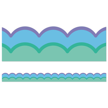 Ideal for bulletin board, white board, cork board, and chalkboard displays, the bulletin board borders are printed on thick but flexible paper that can be cut and layered to add dimension to any display. The bulletin board borders set includes 13 strips of scalloped, 3’ x 3” green and blue border trim with a purple and green border for a total of 39 feet of bulletin board border.