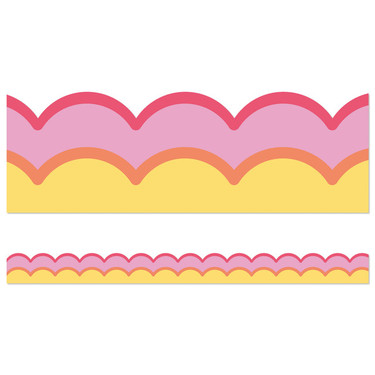 Ideal for bulletin board, white board, cork board, and chalkboard displays, the bulletin board borders are printed on thick but flexible paper that can be cut and layered to add dimension to any display. The bulletin board borders set includes 13 strips of scalloped, 3’ x 3” pink and yellow border trim with a hot pink and orange border for a total of 39 feet of bulletin board border.