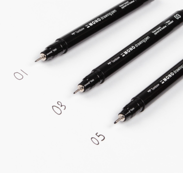 Water-based black pigment ink, with long metal durable tips. Smooth, skip-free, dries instantly with no smudging. 3/pkg - Tip sizes include - 01, 03, 05