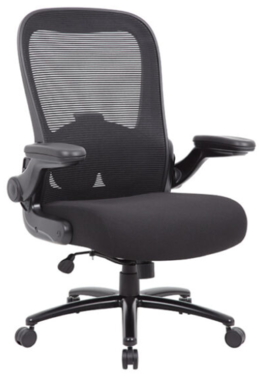 Flip arm task chair features: 400LB weight limit, mesh and foam material, flip up armrests, adjustable seat with height 18"-22" , 5 dual wheel casters, and syncro-tilt mechanism