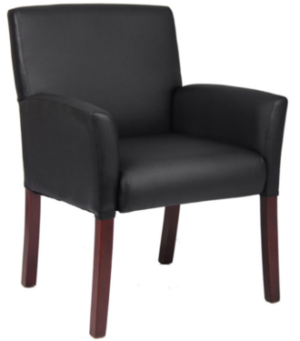Box arm guest chair features: caressoftPlus vinyl, an ergonomic build, spacious arm box styling, mahogany legs, anbd has a weight capacity 275lbs