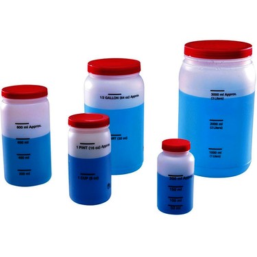 Set of 5 sturdy plastic jars are perfect for both customary and metric measurements and include screw - on covers. Customary capacities are gallon, half-gallon, quart, pint and gill. Metric measurements range from 100 ml to 3000 ml.
