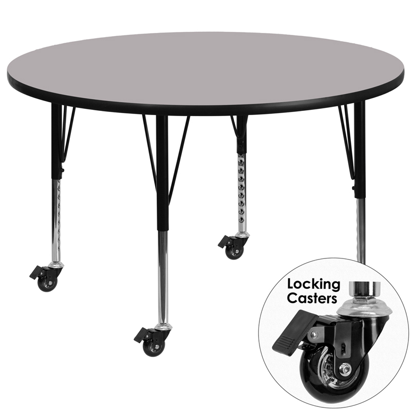Flash Furniture's Preschool XU-A42-RND-GY-T-P-CAS-GG warp resistant thermal fused laminate round activity table features a 1.125'' top and a thermal fused laminate work surface. This Round Laminate activity table provides a durable work surface that is versatile enough for everything from computers to projects or group lessons. This mobile activity table enhances collaborative learning by allowing students to quickly group tables together and lock the wheels for non-movement. Sturdy steel legs adjust from 17.37'' - 25.37'' high and have a brilliant chrome finish. The 1.125'' thick particle board top also incorporates a protective underside backing sheet to prevent moisture absorption and warping. T-mold edge banding provides a durable and attractive edging enhancement that is certain to withstand the rigors of any classroom environment. This model is featured in a beautiful Grey finish that will enhance the beauty of any school setting. [XU-A42-RND-GY-T-P-CAS-GG]