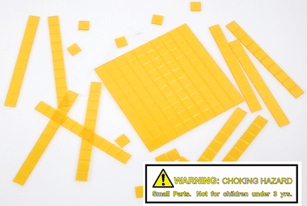 Overhead yellow base ten sets for use on the overhead projector. 62 yellow pieces (40 units, 20 rods, 2 flats)
