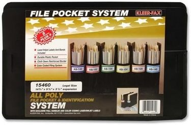 This filing and identification system integrates a black plastic pocket, a removable handle and color coded laser/inkjet printer compatible labels. Black poly pockets with nylon gusset - letter size, 31/2? expansion. Each set has 5 files, 5 handles and 1 multicolored label sheet.