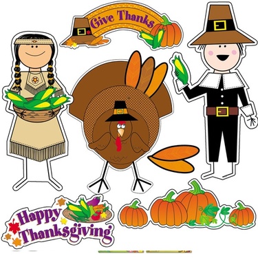 Create fun fall and Thanksgiving bulletin boards with the Stick Kids dressed as pilgrims and Native Americans. Set also features harvest and autumn-themed images including pumpkins, leaves, feathers, and turkey.