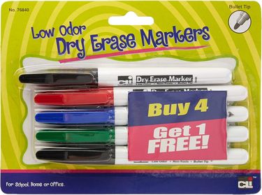 Four pack of low odor, bullet tip, pocket style dry erase markers with one FREE marker. 5 markers per pack. Non-toxic.