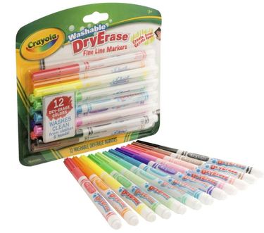 These brightly hued Crayola dry-erase markers wash clean from hands and clothing ans easily wipe off dry-erase surfaces. Recommended for ages 4 up.
