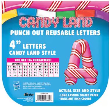 Try Eureka Reusable Punch Out Letters. Printed on coated paper with brillaint rich color, they are perfect for creating personalized projects in displays. Each letter measures at 4". Punch-out, reuseable. Long lasting coated paper. Brilliant rich colors, fun and decorative. Character quantities vary by item.