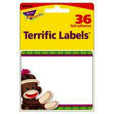 Bright and welcoming labels have a smooth finish for easy, no-smear writing with markers or pens. Tags stay put and won't leave residue on clothes. Perfect as envelope or storage box labels, too. 2 1/2" x 3" ; self-adhesive. 36 per pack. Coordinates with Sock Monkeys Collection.