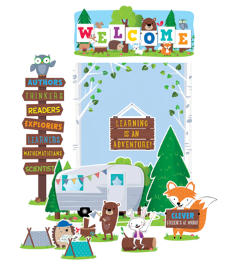 The cute Woodland Friends in this bulletin board will give students a warm and furry welcome back to school! Woodland animals such as the fox, bear, hedgehog, bunny, raccoon, owl and more are perfect friends to start off the school year, and welcome your new troop of student "campers." This 51-piece set features 1 welcome sign, 1 large vintage trailer, 36 student pup tents, 6 woodland animal accents, 2 large trees, a blank wood sign, an owl signpost accent, a "Clever Students at Work" accent fox, a "Learning is an Adventure" sign, and a blank chart. This Woodland Friends Welcome bulletin board set is perfect for use in a variety of classroom displays and themes: science, nature, outdoors, animals, and camping. Pieces range in size from 17" x 7 ½" to 5¾" x 3¾"