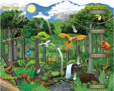 Learn about the layers of the rainforest, soil and the water cycle when fitting this 101 piece Eco-Puzzle™ together. Puzzle includes 15 sparkly pieces and 15 fuzzy pieces to easily identify water, animals and plants. Also contains a full size poster and 4-page rainforest guide.