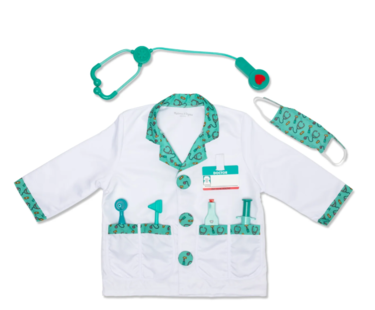 Includes jacket, mask, stethoscope, reflex hammer, ear scope, syringe, and reusable name tag