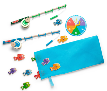 Catch some laughs and learning with this wooden magnetic play set--complete with working wind-up reel! The 10 magnetic fish are numbered and patterned to enrich matching, sorting, and counting activities, and two wooden rods make collecting them a blast! Kids can use the spinner to play as a game, or just have fun collecting the pieces over and over again. Either way, there's plenty of fun in this sea! Dimensions: 7.25" x 18" x 2.5" Packaged.