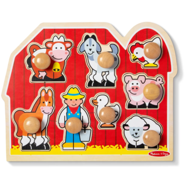 Seven favorite farm animals and a farmer stand out against the big red barn. This extra-thick wooden puzzle includes eight pieces, with jumbo wooden knobs that are easy for children to grasp. Full-color matching pictures appear underneath each piece to help with matching. Encourages hand-eye, fine motor, and visual perception skills.