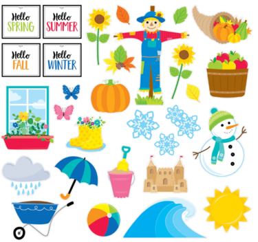 Bring the seasons to life with this Year-Round Seasonal Accents Bulletin Board. This set includes pieces that represent decorations for fall, winter, spring, and summer, as well as holiday decorations for Halloween, Thanksgiving, and Christmas.