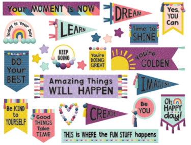Remind your students that “Amazing Things Will Happen” with this uplifting and lively mini bulletin board. The motivational messages are displayed on signs in a variety of shapes, colors, and sizes. Includes 18 positive sayings pieces, 8 stars accents, 1 pompom heart, and a guide with suggestions and activities. Largest piece measures 20½'' x 5¾''. 27 total pieces.