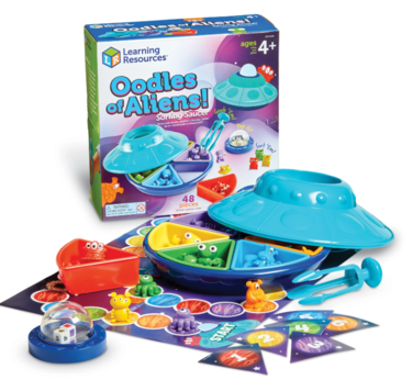 Grab the Tri-Grip Tongs, pop the dice, and help these aliens sort out their spaceship in a sorting game of cosmic proportions! Kids learn preschool sorting, fine motor skills, and more with every trip aboard the Oodles of Aliens Sorting Saucer from Learning Resources. This fun sorting saucer opens to reveal color-coded trays and the aliens that inhabit them. Spread the aliens out on the table, pop the dice, and use the Tri-Grip Tongs to grab and sort them into place! In addition to sorting, this game builds three additional preschool skills at once-strengthen your counting, color recognition, and fine motor skills every time you play! The Oodles of Aliens Sorting Saucer includes 30 alien creature figures that store inside for easy clean-up, as well as an activity guide with fun sorting games! This fine motor sorting game makes a great addition to preschool and homeschool resources, as well as kindergarten activities!
