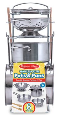 This play set features shiny stainless steel cookware Mom and Dad would envy! Generously sized (5 inch diameter) for a more realistic look and feel, the colander and three pans (with interchangeable lid) fit most play food items for exciting restaurant and kitchen play, and store neatly on a convenient storage rack when the kitchen is closed. All of the handles and knobs feature sturdy riveted joints that won't weaken and wear like welding or glue. With two hardwood utensils included and stainless steel pieces polished to a gorgeous mirror-finish, this set is truly top shelf!