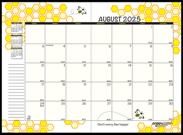 August thoughout July. With different honey comb graphic and bee saying. Notes space on the left, previous and following month reference calendar. Includes Julian dates and days remaining, 3 year refrence calendar, future holiday pages, name, address, phone and email pages.