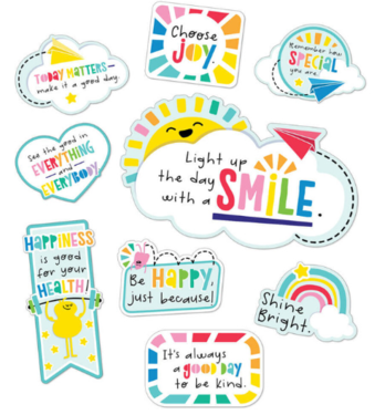Keep your students inspired year-round with Carson Dellosa's Happy Place Mini Motivational Bulletin Board Set. The 15-piece bulletin board bundle features 3 motivational signs, each assembled from 2 pieces. The set also includes 9 mini motivational signs. Each poster features an inspirational quote such as, "Choose Joy", "Shine Bright", "Find Time to Play", and more.