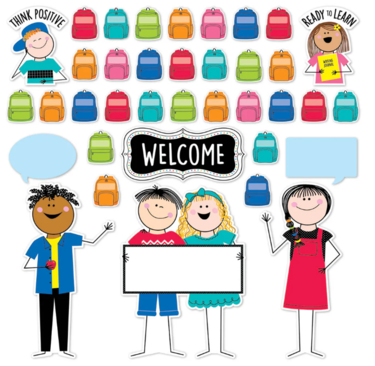 41-PIECE SET – The All Are Welcome set includes a welcome sign, 32 colorful student backpack pieces, 6 smiling Stick Kid student, and 3 blank speech bubbles.