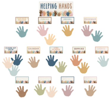 Encourage young learners to step up and make a difference with this stylish bulletin board set featuring colorful handprints. Students will be inspired and motivated to be young leaders in the classroom. Set includes 48 pieces: 1 “Helping Hands” title piece; 9 job title signs (Line Leader, Papers, Pencils, Messenger, Clean-Up Crew, Supplies, Teacher’s Helper, Lights, Calendar); 4 blank job signs; 34 hands for student names; Bulletin Board Guide with suggestions and activities. Title piece measures 12-1/4" x 5-1/4".