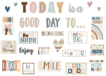 Includes 32 total pieces: 12 title pieces spelling out “Today Is a Good Day to…,” 16 decorative signs with positive messages, 4 heart accents, and bulletin board guide with suggestions and activities. “Believe in Yourself” piece measures 5" x 9 3/4".