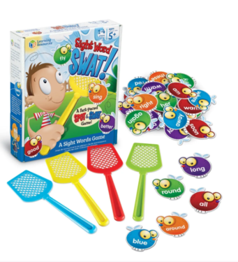 With 5 levels of play, this game is for everyone! After one of the 220 Dolch sight words is called out, use your swatter to swat the word on the matching fly. Collect the most flies and win! For 1-4 players. Swatters measure 9"L each.