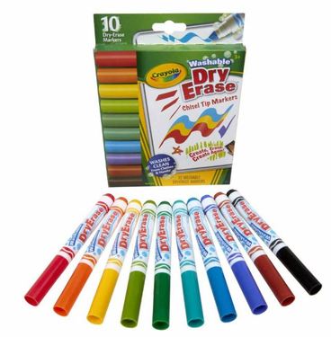Crayola Washable Dura-Wedge Tip Dry-Erase Markers - Create, erase and create again with these bright, Washable Dura-wedge Tip Dry-erase Markers that are great for at home, school and on-the-go. Solve the problem of how to clean dry-erase markers from fabric or skin using this washable, dry-erase marker set. Dura-wedge tip is great for creating fine lines or coloring in large areas while scheduling, organizing and practicing letters and numbers. Markers are also fun for children to color pictures on dry-erase boards. The 10 vibrant colors include a perfect array of shades for anything from color-coding a schedule to making a vibrant work of art. Safe, nontoxic markers are ideal for children ages 3 and up.