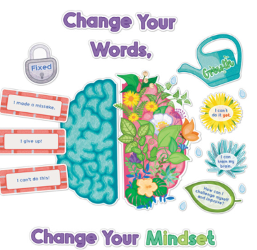 Create a healthy learning environment that inspires positive thinking for future success both in and out of the classroom. The 47-piece set includes a 6-piece "Change Your Words, Change Your Mindset" header, a 4-piece brain, fixed & growth mindset labels, 9 fixed mindset phrases and 9 growth mindset phrases, a motivational poster, 1 flower and 15 water drop cutouts.