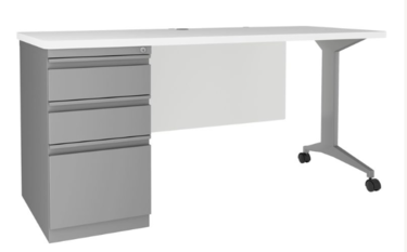 T-leg creates a modern design, with locking casters and a pedestal with full-width handles. File drawer accommodates letter-size hanging files, and a box/box/file drawer configuration.
