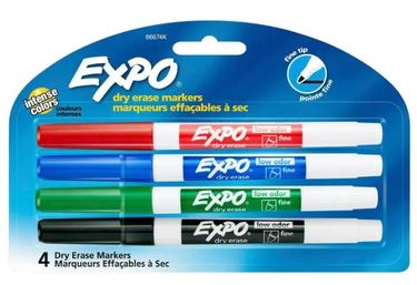 Intense colors. Add excitement. Add emphasis. Add color! Use Expo colors to track, schedule and present. For use on whiteboards, glass and most non-porous surfaces. Specially formulated low odor ink. Fine Tip allows you to mark fine lines on smaller boards. Contents: 4 Expo assorted ink low odor dry erase markers. Conforms to ASTM D-4632. Non toxic. Made in USA